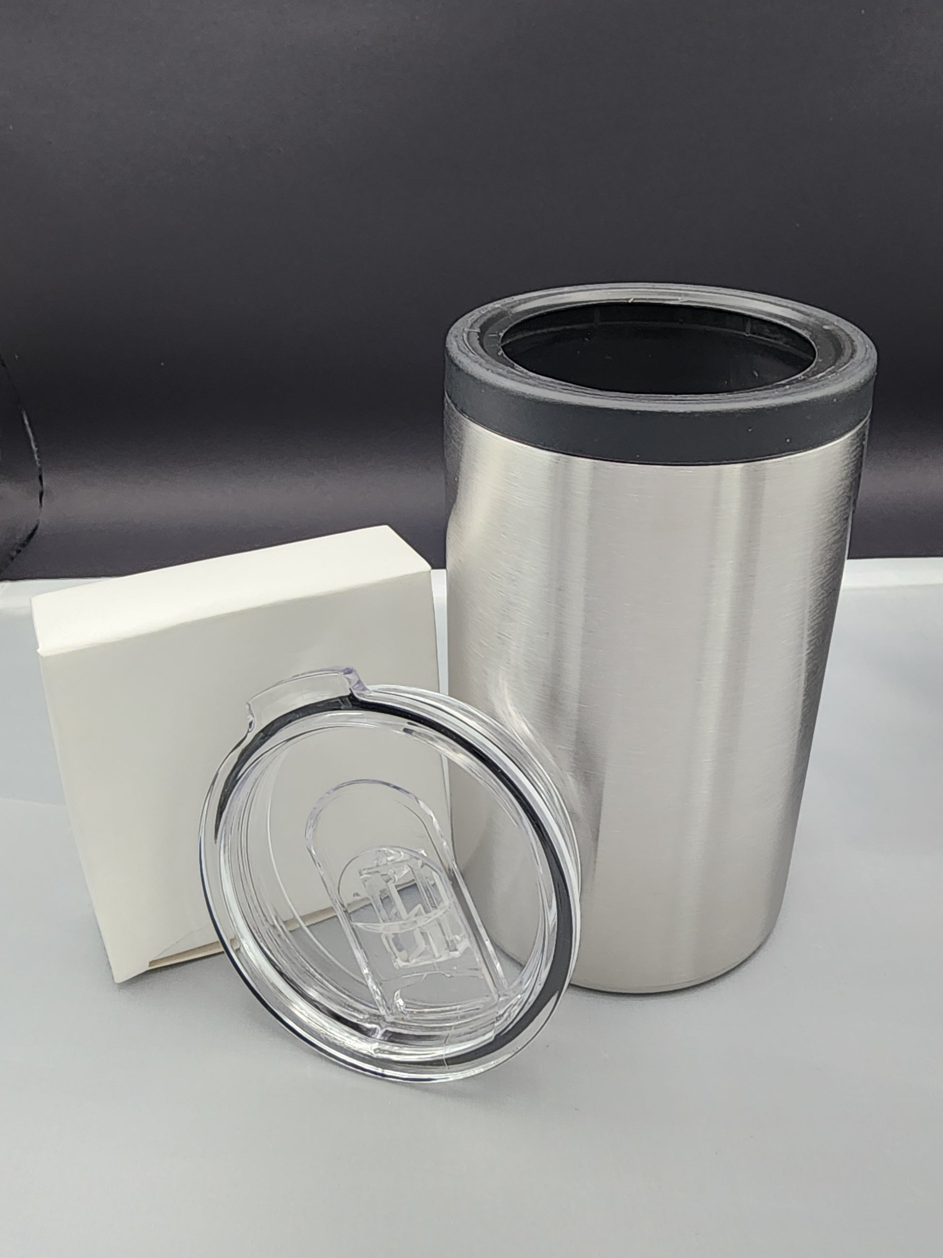 A 2 in 1 product! A stainless steel can cooler to hold your favorite 12oz beverage. Fits standard 12oz beer/soda cans and standard beer bottles. It’s also a 12oz tumbler with straw and slide lid!